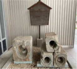 キャンパス南エリアにある自然科学本館前には,金沢城辰巳用水石管と説明板が展示されています。これは,旧工学部秀峰会館内(小立野キャンパス)に展示されていたものをキャンパス移転時に一緒に移設したものです。しかし,現在は,以下のとおり説明板が老朽して内容が確認できない状態になっています。