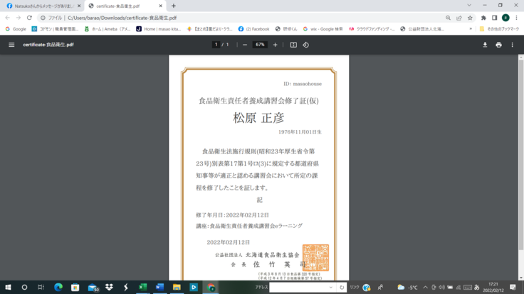 食品衛生責任者の資格とれました。海鮮の配送なども、責任もって。