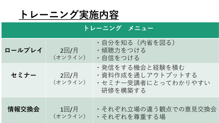 キャリアコンサルタントや産業カウンセラーの資格保有者、またはこれから取得したいと思っている方などが、トレーニングを通しブラッシュアップを図ります。また、そのトレーニング成果を、ボランティア活動を通し発揮していきます。資格は持っているけど、活用していないような方でも自信を付け社会で活躍できるようにしていきたいと思っています。