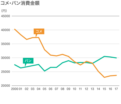 2011年に一般家庭の食料品への支出額で、初めてパンがコメを上回り、翌年はわずかにコメが再逆転したものの、2013年以降、パンへの支出が上回る状態が続いています。