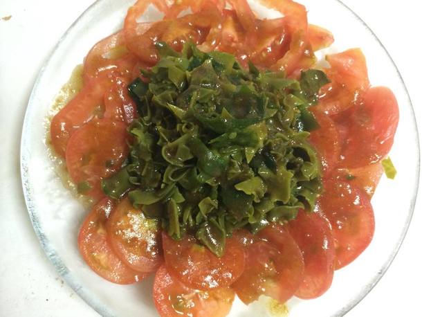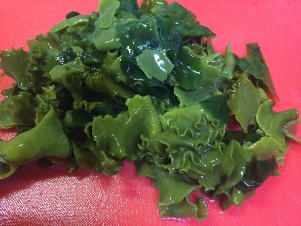 海藻類はサラダへ (干し雌株は包丁で叩くと粘りがでます)
