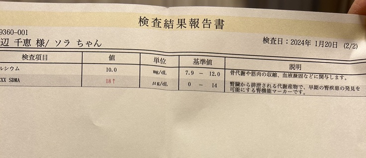 ソラの場合、腎臓の数値が気になっていて普段から腎臓サポートのご飯を食べています。SDMAも一緒にお願いしました。SDMAは高めです。腎臓サポートのご飯を継続していきます。