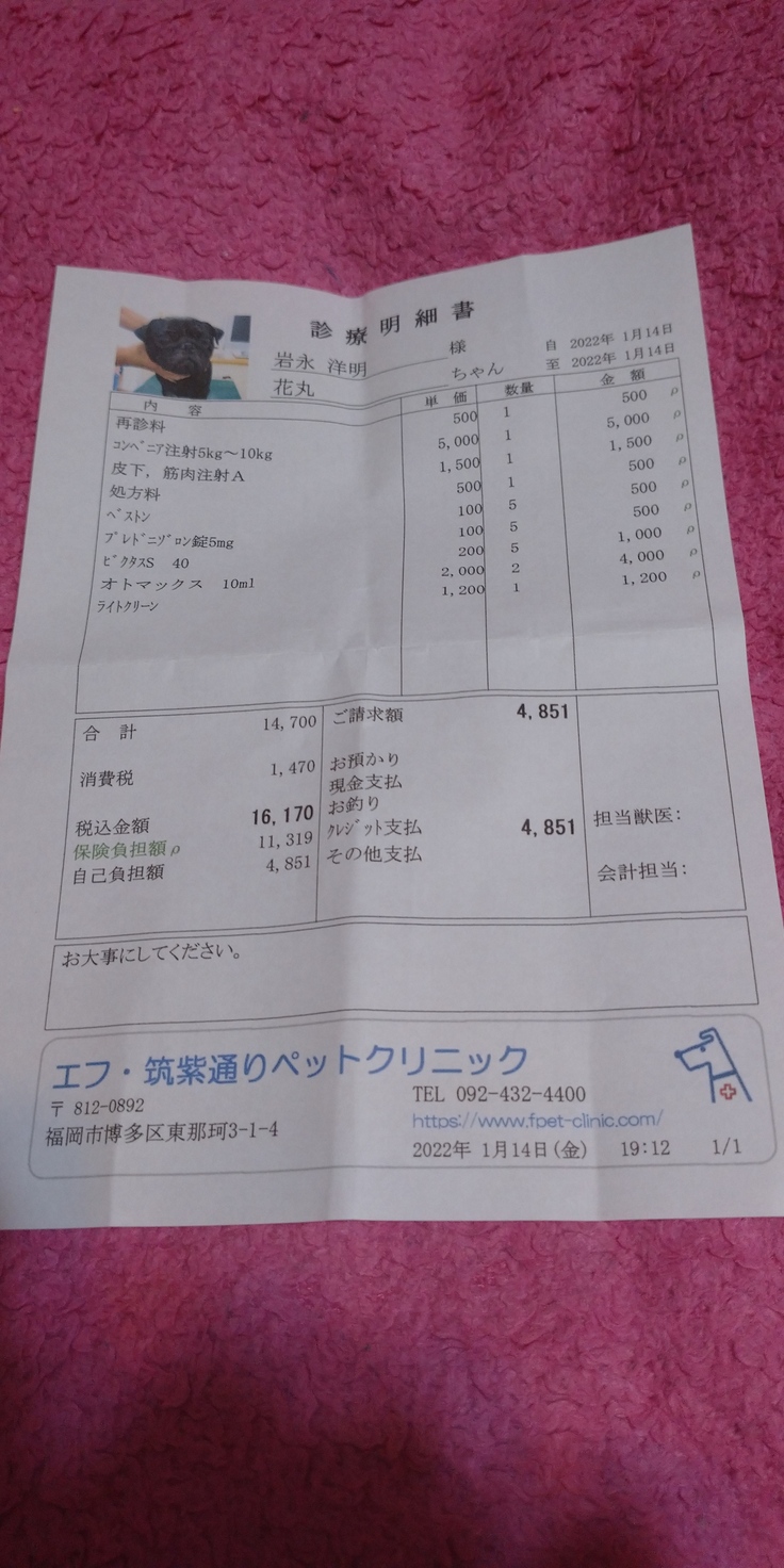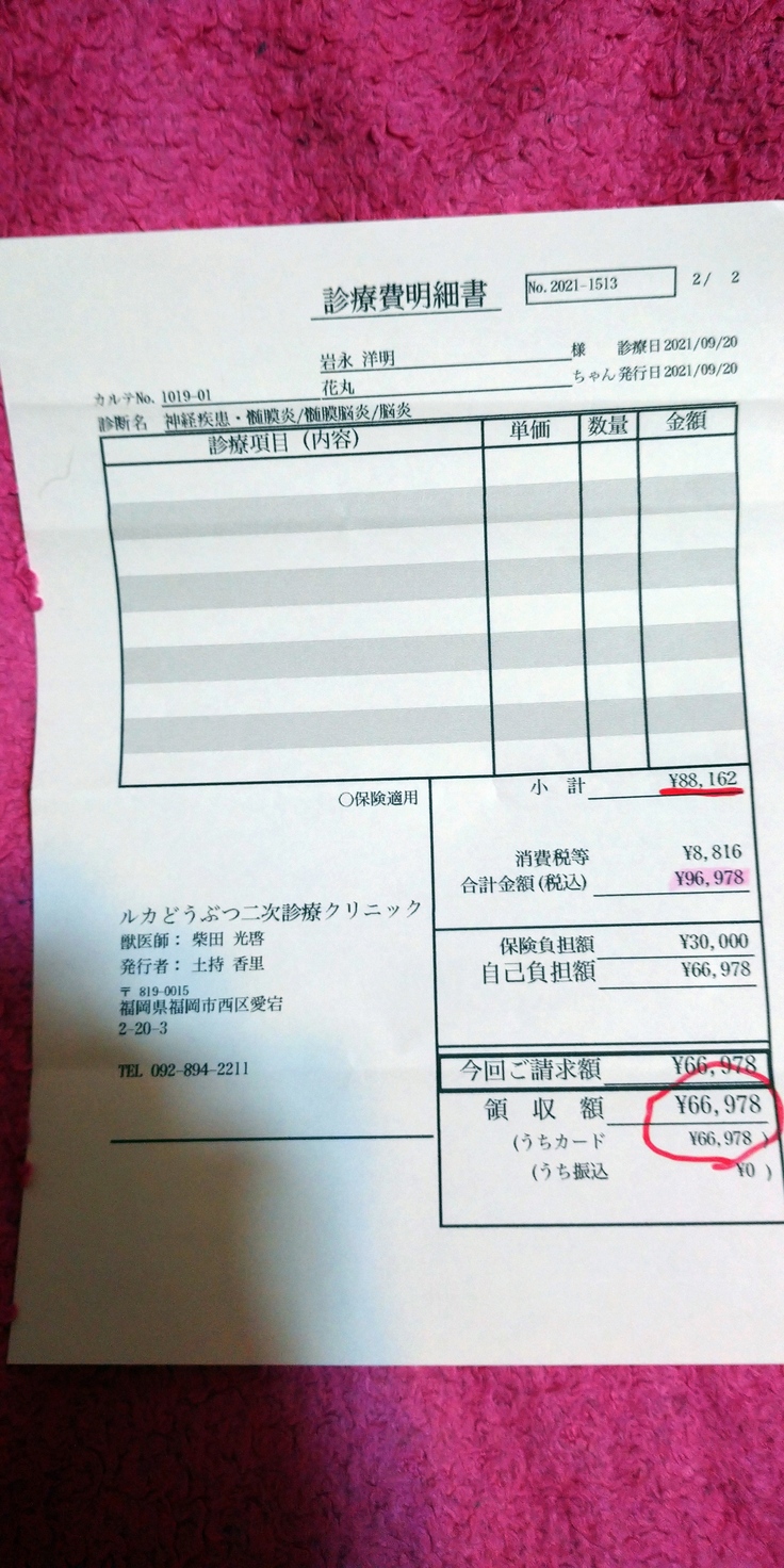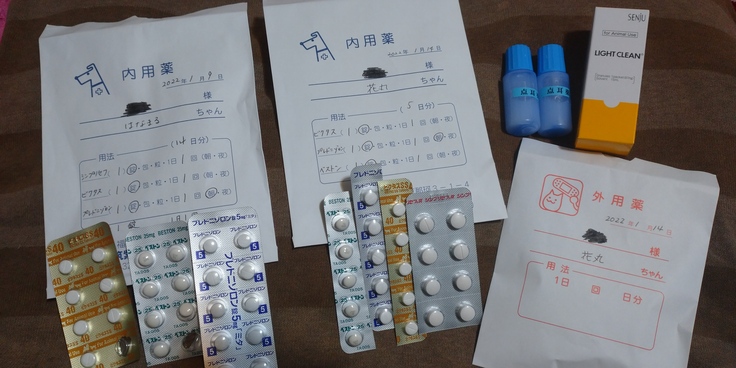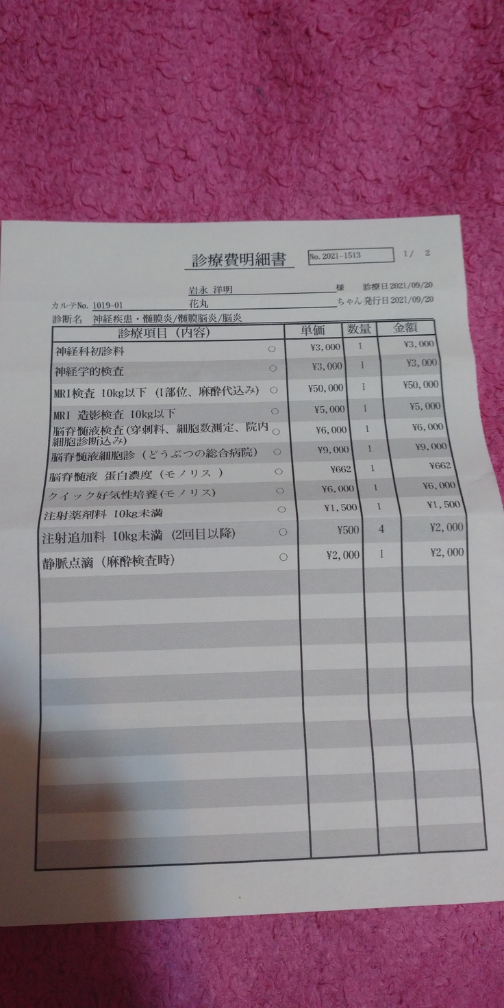 先生によると、普通の子が持っている細菌の数だと『5』ですが花丸は『20000』以上の細菌が耳の中にあり、脳内に流れ込んだ細菌を殺すため9月から、10月18日までは1週間に1度、ステロイドと抗生物質の注射と飲み薬を与えて、現在は2週に1度同じ治療が続いております。