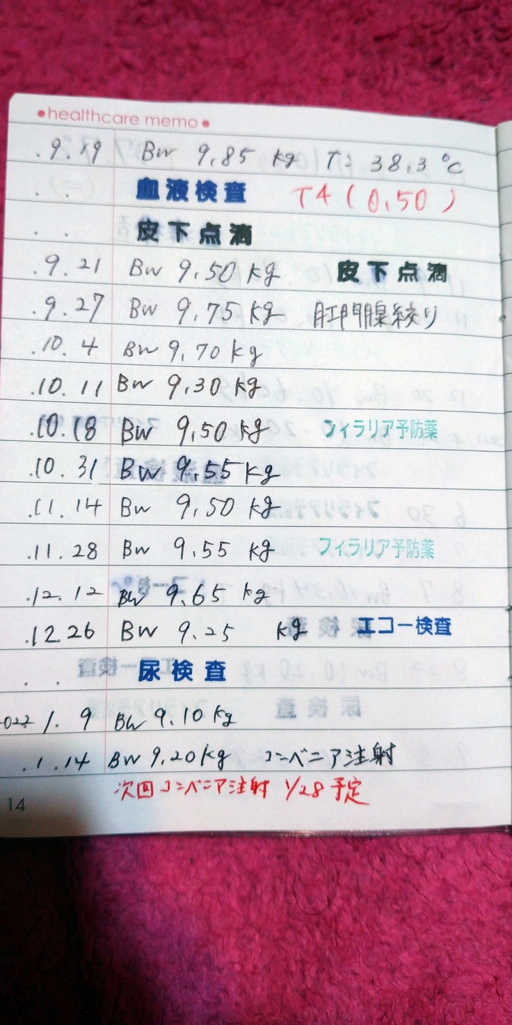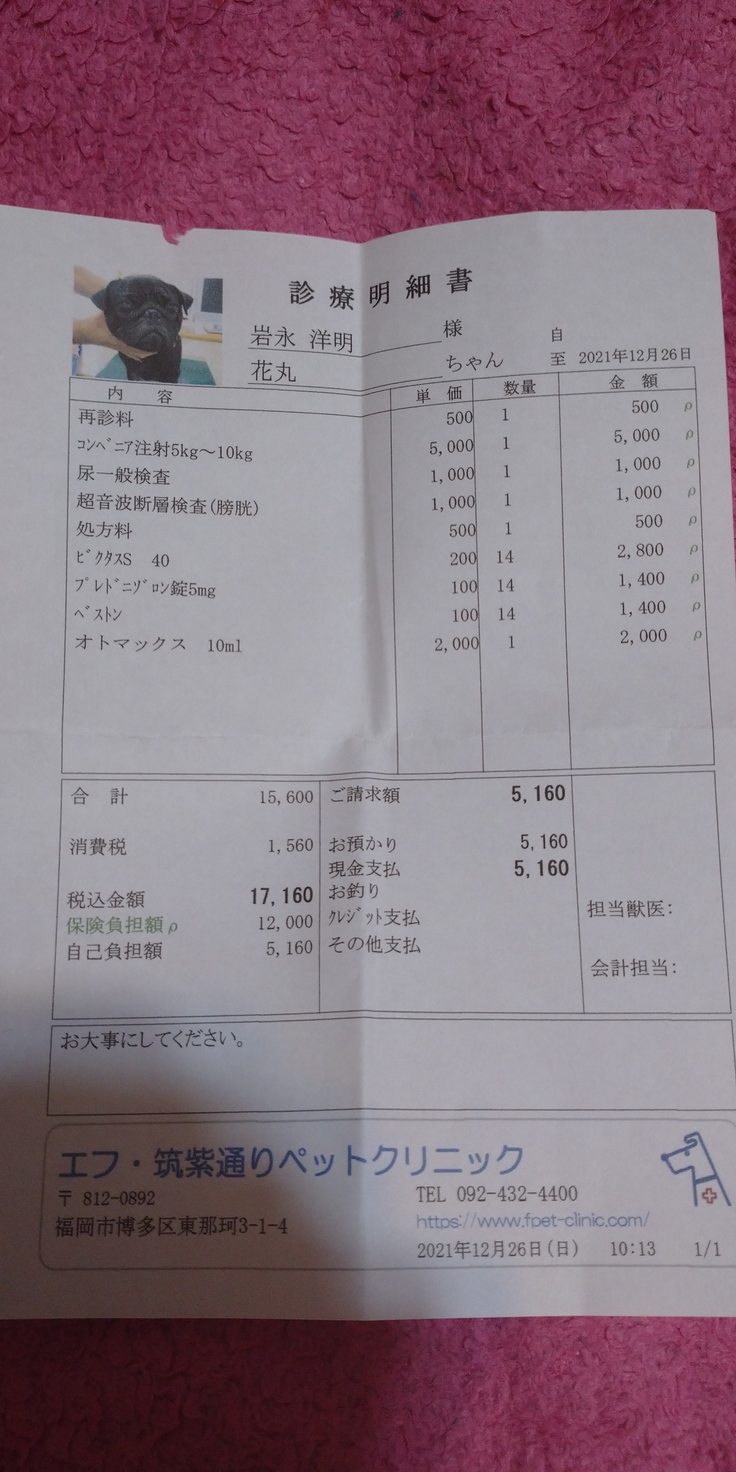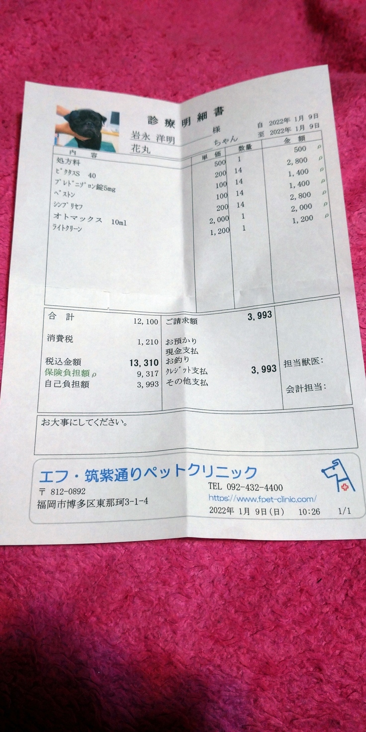 先生によると、普通の子が持っている細菌の数だと『5』ですが花丸は『20000』以上の細菌が耳の中にあり、脳内に流れ込んだ細菌を殺すため9月から、10月18日までは1週間に1度、ステロイドと抗生物質の注射と飲み薬を与えて、現在は2週に1度同じ治療が続いております。