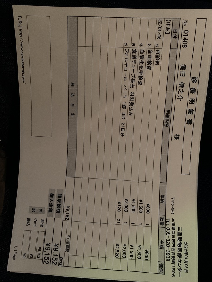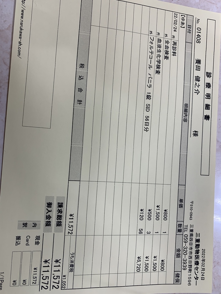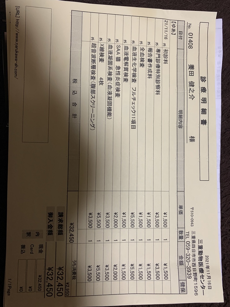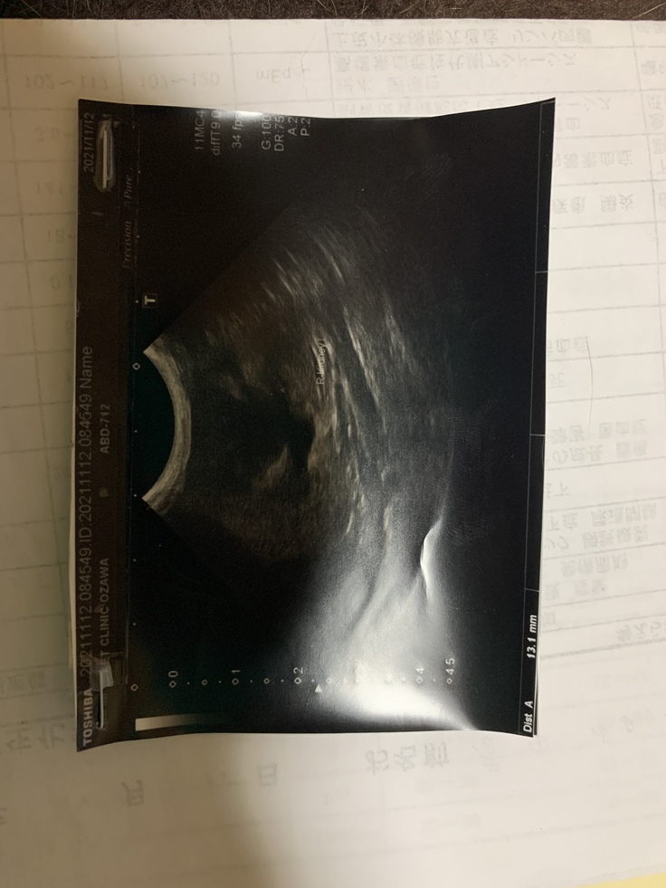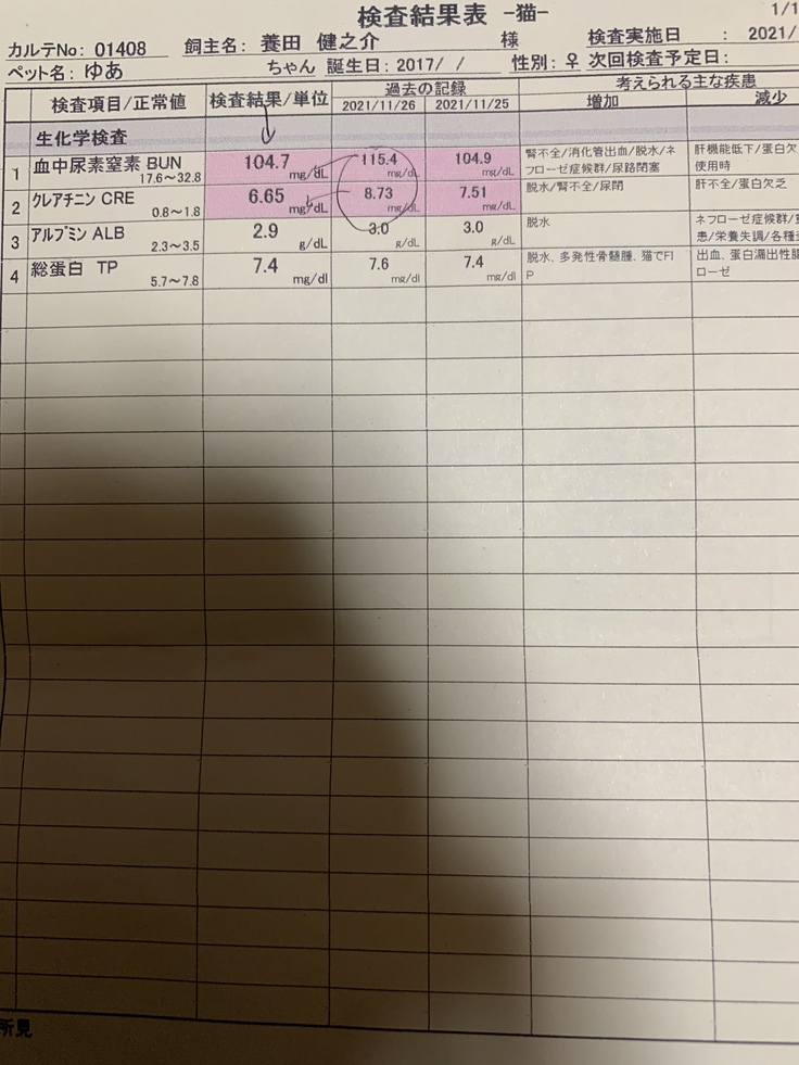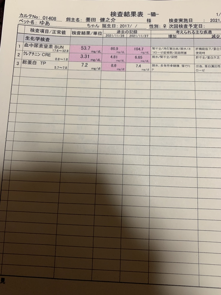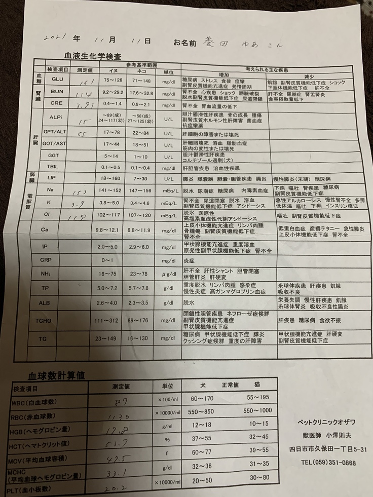 病院へ行き血液検査をすると腎臓の数値のBUN(血中尿素窒素)が114、CRE(クレアチニン)が3,91と両方の腎臓の数値が正常値のおよそ4倍ありました。