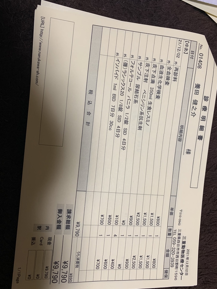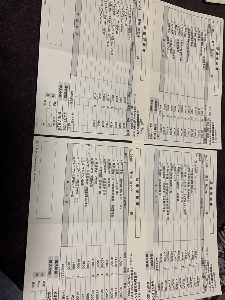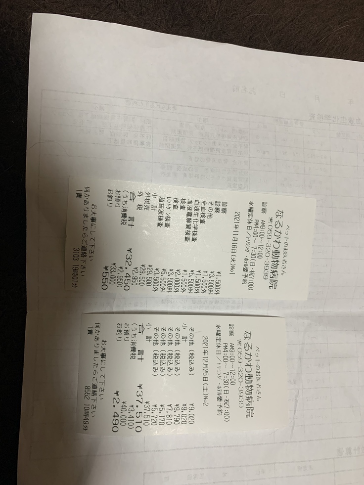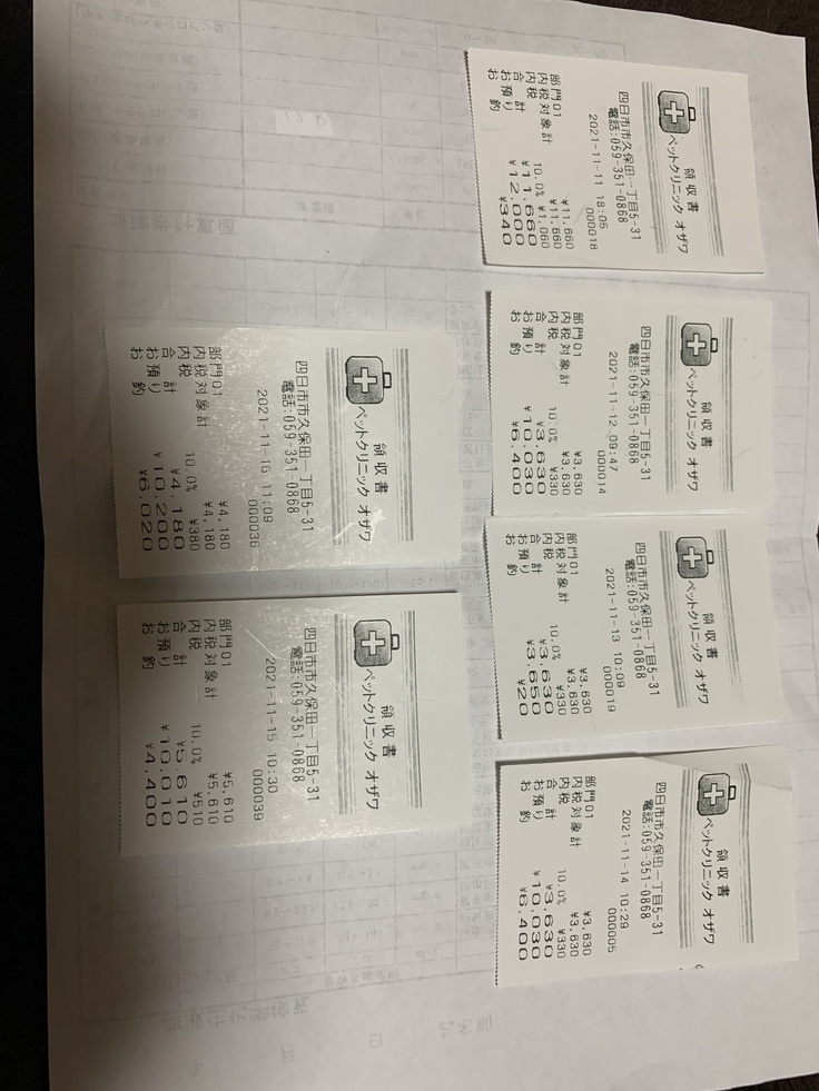 毎日通院で一回の料金の平均が5千円から1万円くらいです。徐々に腎臓の数値も改善されてきて通院も3日に1回くらいになり、その後5日に1回くらいになり、治療が継続中です。どうか最後まで治療をさせていただきたいのでよろしくお願いします。