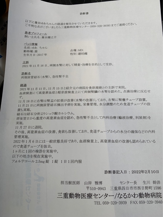 尿管結石はとれて石も見せてもらいました。しかし腎臓の数値は変わらず高いままです。今後腎臓の数値がどこまで改善するかは優愛ちゃんの生命力次第とのことでした。痩せ細り、体にチューブをつけて元気のない優愛ちゃんを見て本当に手術をしてこの子のためになったのか、苦しい思いをさせてしまっただけだったのかなと思いました。