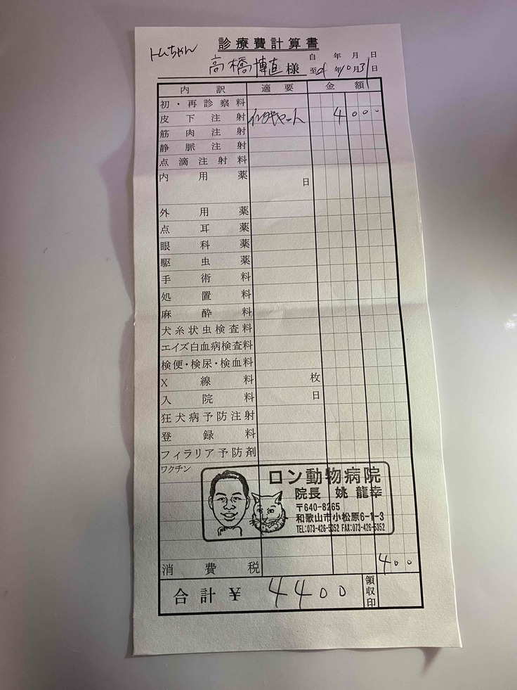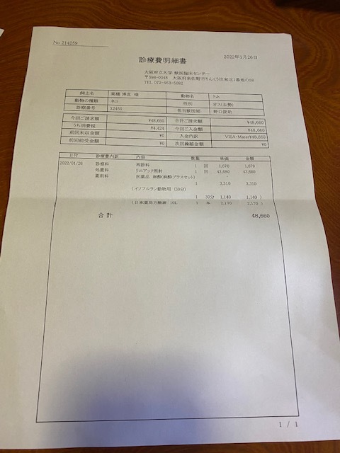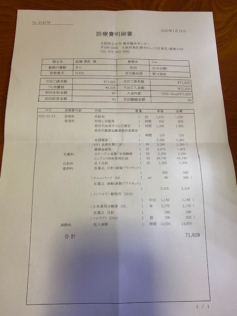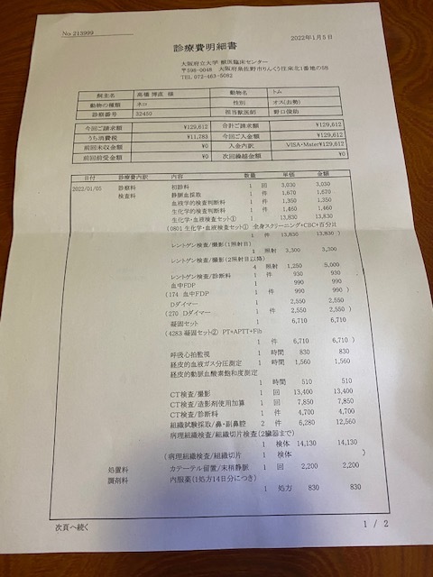 抗生物質の効果が見えないため別の抗生物質に変更、並行して大阪府立大学の動物病院のCT予約。