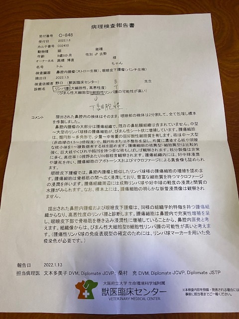 1月12日:電話にてリンパ腫と診断結果の連絡あり。放射線治療を打診される。