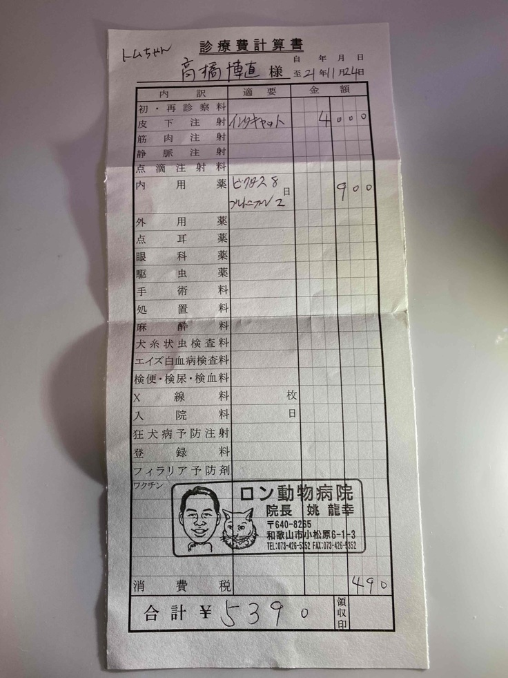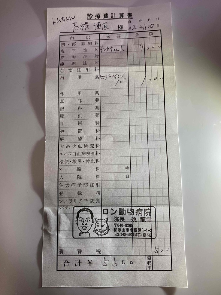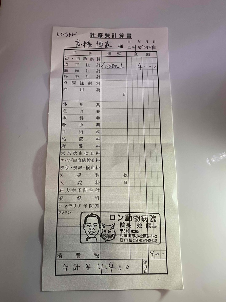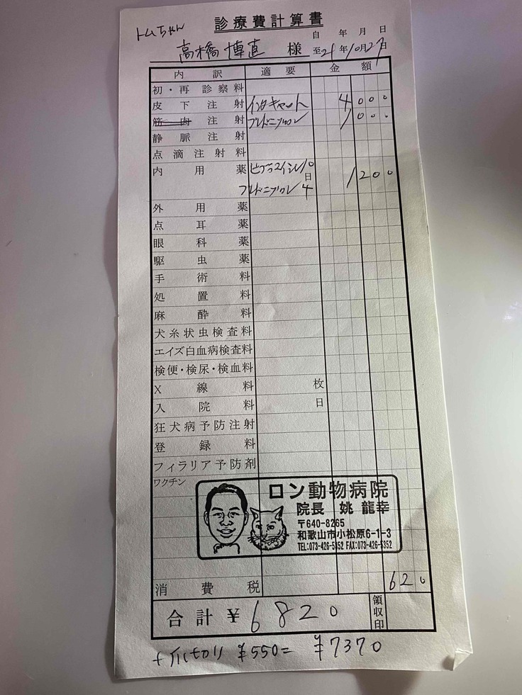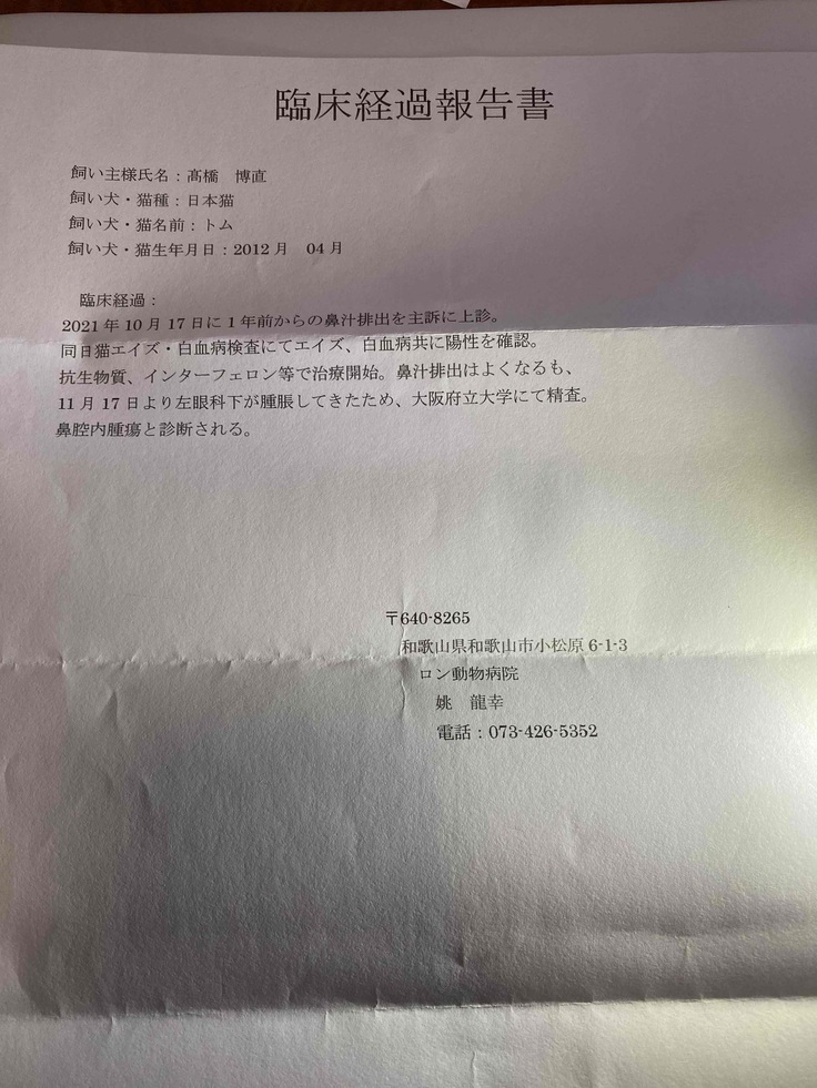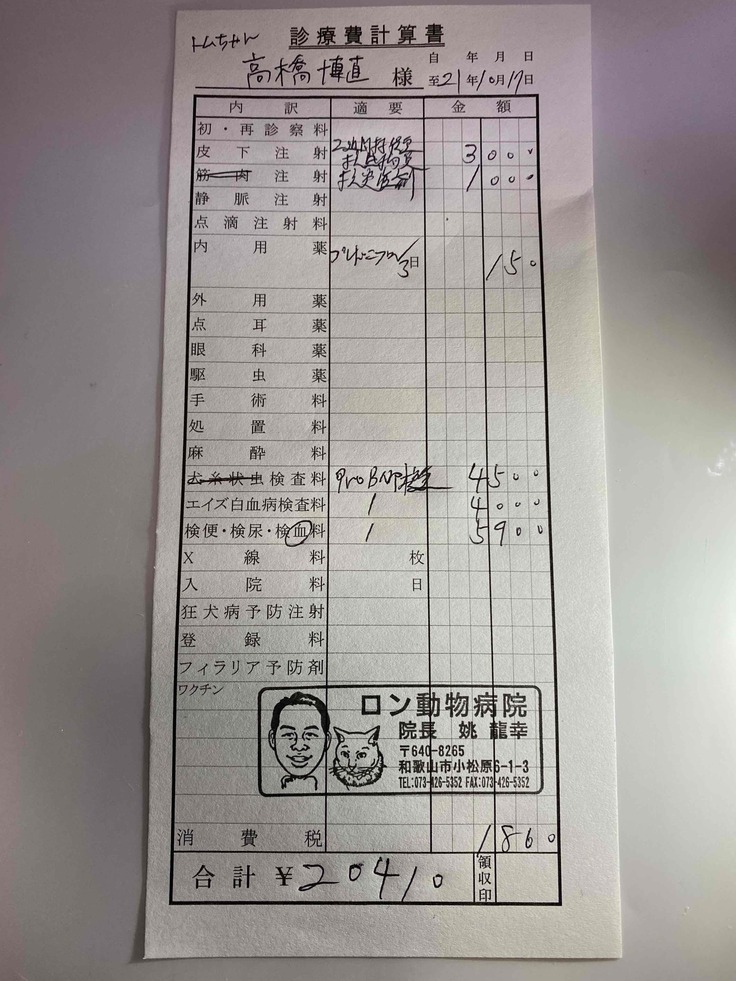 この時の血液検査はぎりぎりではありましたが正常とのこと。目の下のしこりはレントゲン撮影、その時は、涙腺か鼻からの感染、歯槽膿漏かもと診断。インターフェロンと抗生物質注射、抗生物質を処方してもらい診察終了。