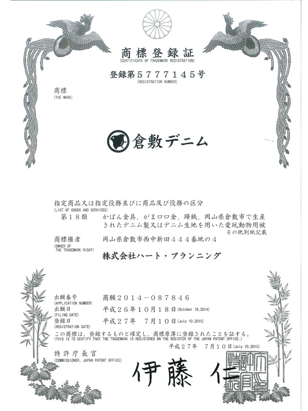 平成27年に『倉敷デニム』の商標登録を取得ました。