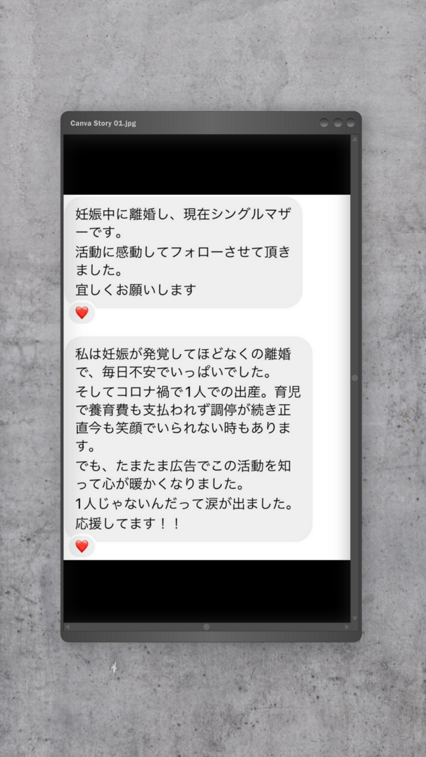 本日は、本 PJ専用Instagramアカウント宛に、シングルマザーの方々から、本 PJの活動を見て1人じゃないんだと元気をもらえたというDMを数件いただきました。