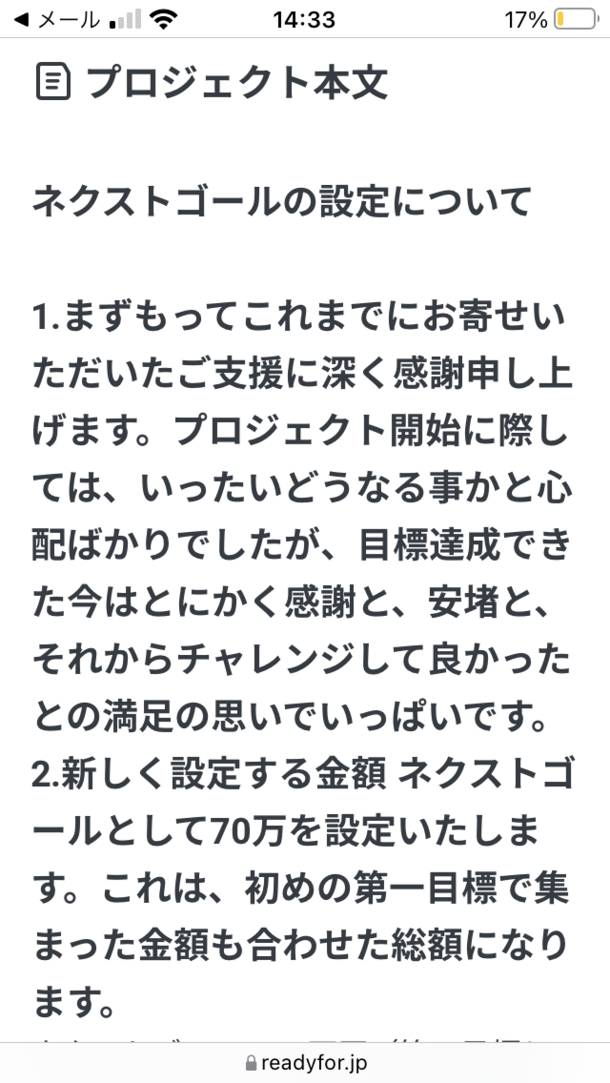 プロジェクト満了の期限まで残り数日がありますので、クラウドファンディング運営からのアドバイスに従い、ネクストゴールを設定し、70万の目標(達成できた当初の目標50万を含みます)にチャレンジします。