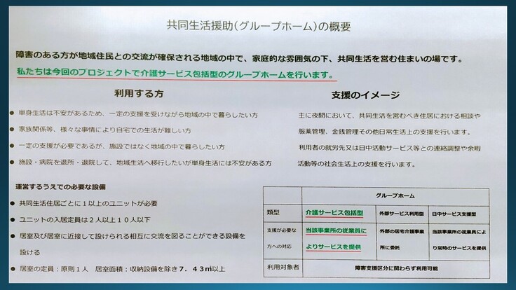 しかし、障がいのある方が支援を受けながら生活する場であるグループホームは国が目標値をあげて整備を進めていますが、まだまだ不足しているのが実情です。