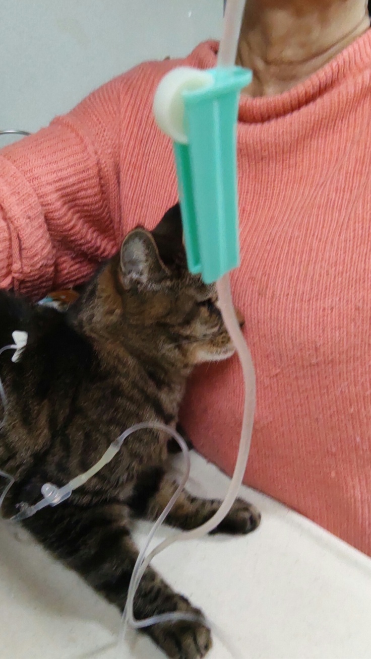 18才のまるちゃんは、発症はしていませんが、エイズのキャリアで、少しの油断も出来ません。甲状腺亢進症で、継続治療しています。今一番気がかりなのは、腎臓がかなりわるくて、毎日の点滴で、小康をたもっています。