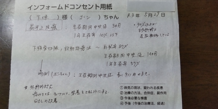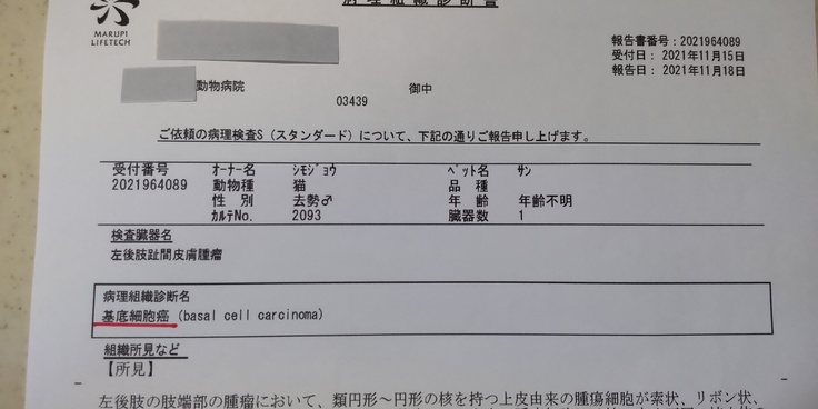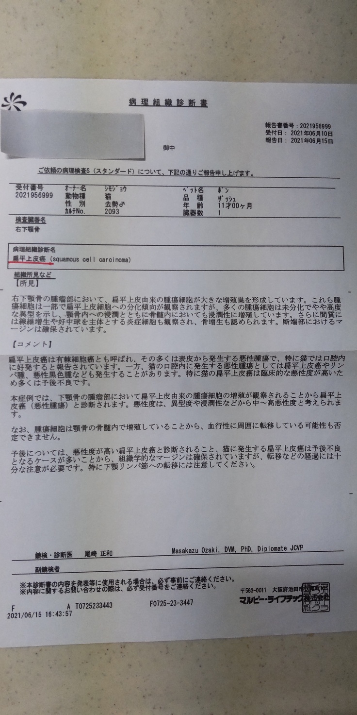 結果は悪性度の高い扁平上皮癌でした。進行もとても早い癌とのことでした。