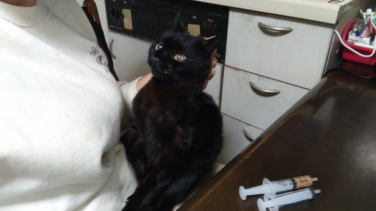 ●くろ子ちゃんに注射器で強制的に高栄養食を食べさせています
