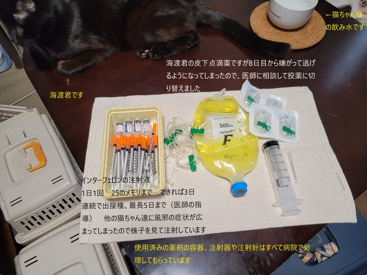 広い家ではないので、風邪が他の子に順番に感染している状況です。追加のインターキャットのセットが必要で、1本セット(11,000円)のインターキャットを常時ストックしておかなければなりません。注射が打てない子は病院に連れていくようにしています。