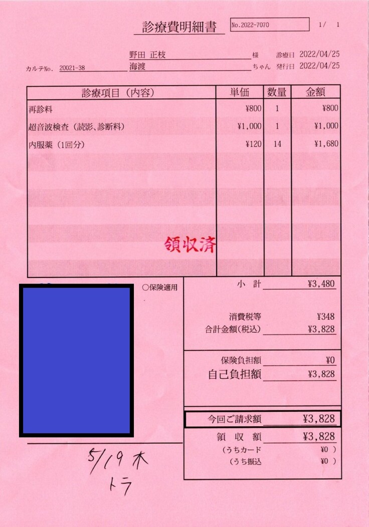 今回の診療は「超音波検査」だけだったので、診療費がおさえられました。