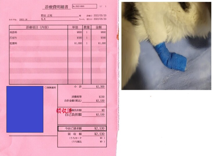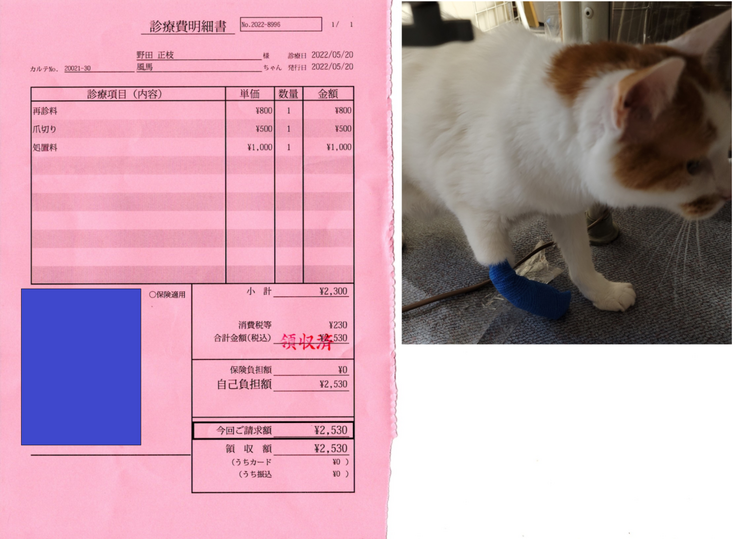 出血しなければいいなっと思いましたが2匹ともそれぞれ片方の爪が肉球に刺さっていて、出血したため抗生剤の塗り薬と止血止めの処置で済みました。