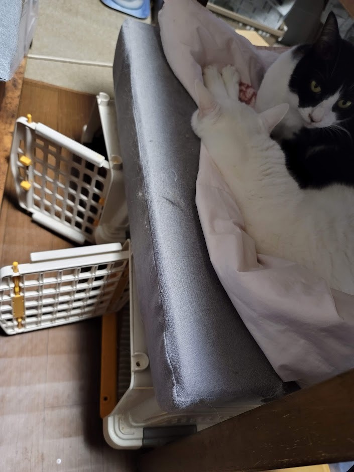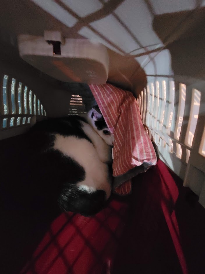 残りのニャンずは手ごわいので、ベッド代わりのキャリーバッグ