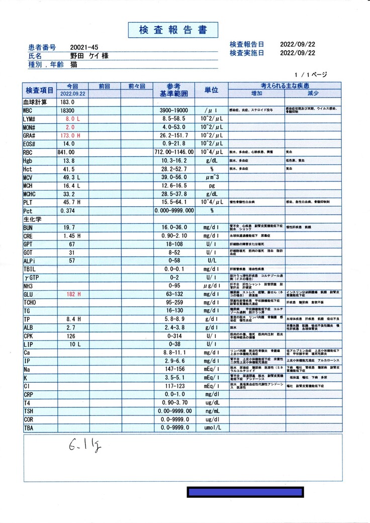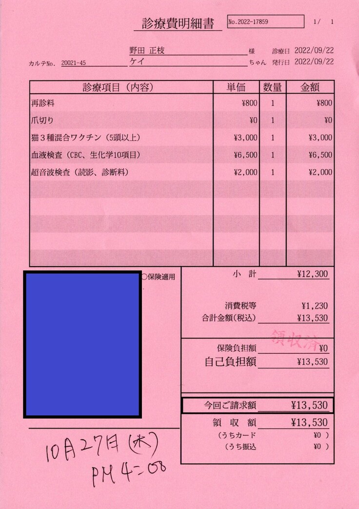 ケイ君の血液検査、エコー、爪切りの後ワクチン接種をしました。