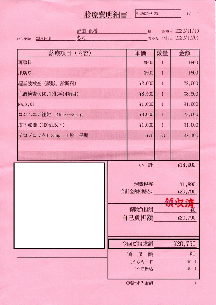 診療費も、私自身の治療で病院に行けなくて12月1日に支払いをしました。