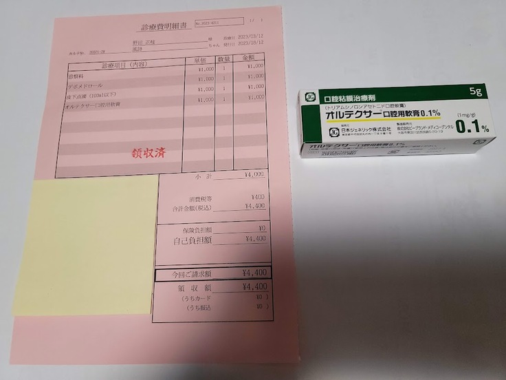 抗生剤他の注射をしてもらい、オルテクサー口膣用難航を処方してもらい
