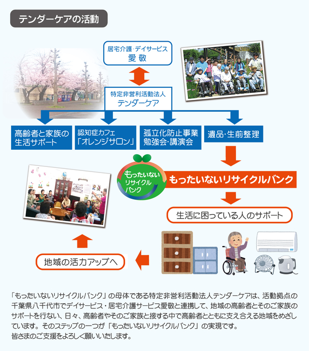 はじめまして、NPO法人テンダーケアの渡邊常夫です。これまで、孤立化防止の支援、認知症の方が集う「オレンジカフェ」など実施してきましたが、この度、生活困窮支援法の制定に伴い『もったいないリサイクルバンク』を立ち上げました。