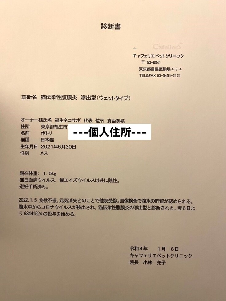 ポトリのFIP治療を継続し完全寛解を目指します。 FIP治療の新薬費用に集まったご支援金を使わせて頂きます。