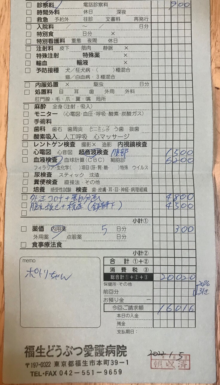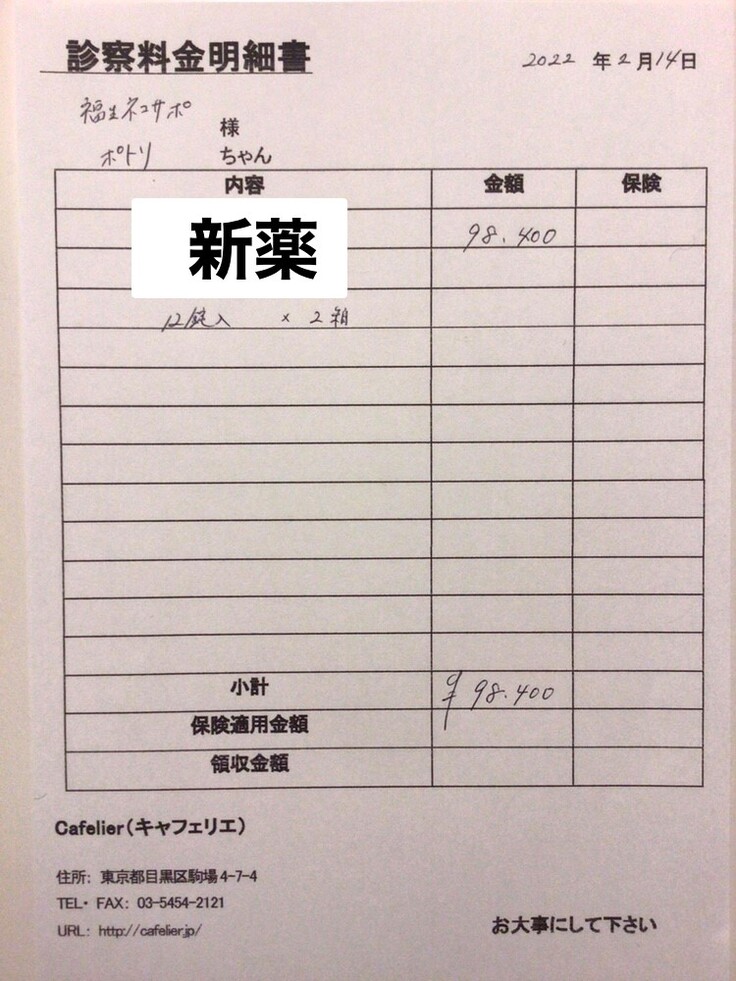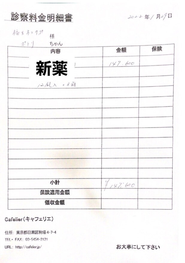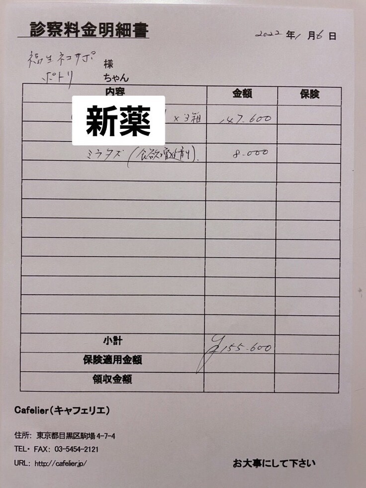 FIP新薬費用と検査費用、その他の治療薬とかなり医療費が掛かっています。