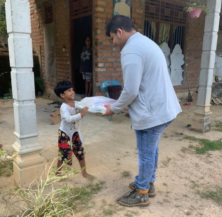 [チームメンバーのANJANAさんが子供たちに支援物資を持っていった時の様子]