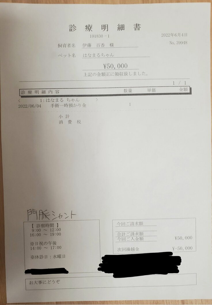 ご支援金は、今回の手術費用、門脈シャントの受診・検査・入院費用、嘔吐・下痢(原虫・食物アレルギー)の症状のための受診・検査・入院費用、術後の受診・検査費用にご充てさせていただく予定です。