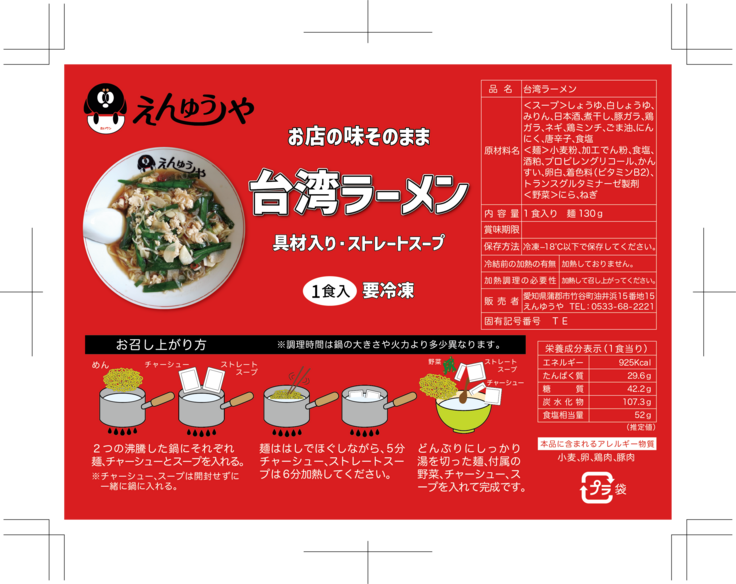 愛知産の豚骨、鶏ガラなどで8時間じっくりとスープを取りご当地ラーメンの台湾ラーメンをお店の味そのままにご自宅へお送り致します。具材も愛知産鶏ミンチ、国産野菜等も一緒に包装してあり、スープもストレススープです。インスタントとは一味も二味も違います。