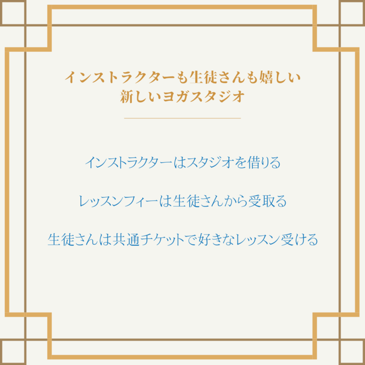- 生徒さんにとっては、ヨガスタジオに通っているのと同じイメージなので、インストラクターが個人で場所を借りてレッスンを行うよりも、集客が見込める。