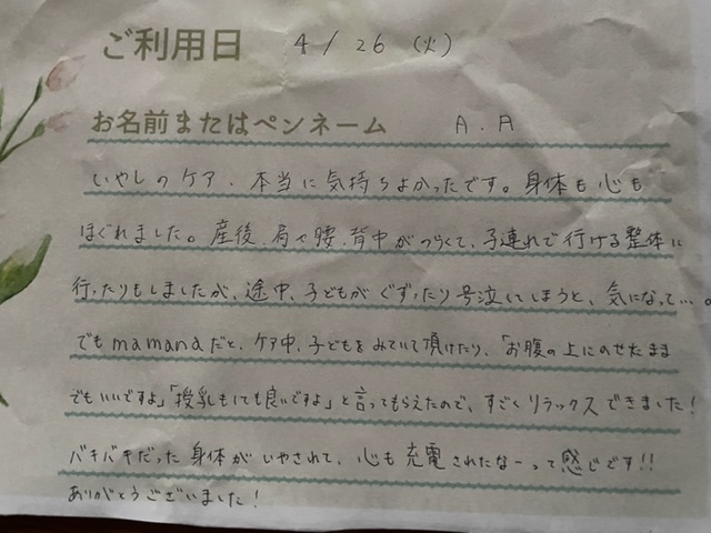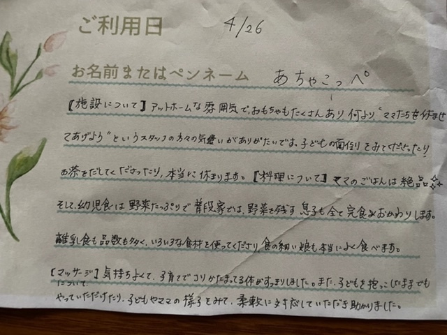 「日中子どもと自分だけの時間が本当に辛かった。ここに来ることで、気分転換になるし安定する」と、利用されたママからお声をいただきました。中には、コロナが不安で1年間全く子どもを家の外に出さなかったというママもおられ、「子どものために、今日は来ました」とご来院くださる方もいました。