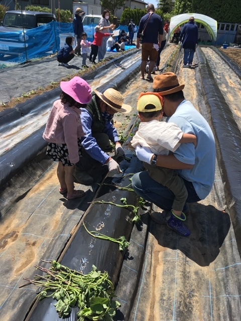 今日使用するサツマイモ苗は、ハロウィンスイートというとっても甘い品種。βカロテンが普通の100倍なんだそう。大切な苗を農家さんの指導の元、子ども達が丁寧に土に植え、パパやママがそっと土をかぶせます。
