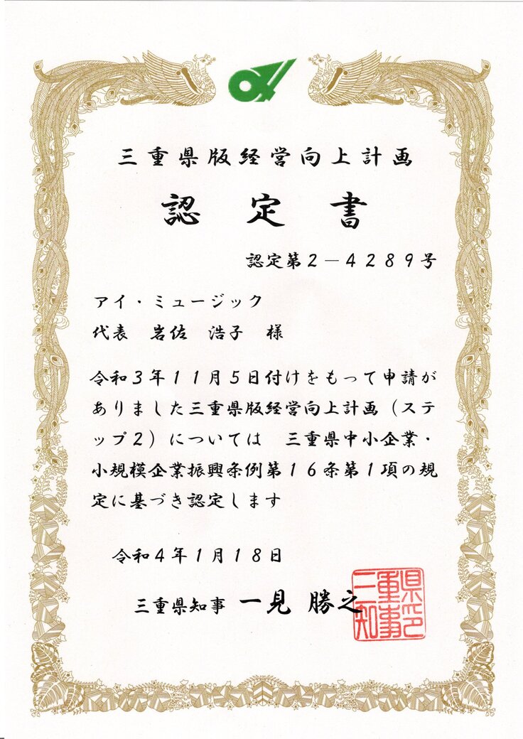 そんな中、三重県の補助金を利用して小さなコンサートを行い、三重県中小企業・小規模企業振興条例第16条第1項の規定に基づき、三重県版経営向上計画が認定され、認定書をいただきました。私たちの強みとなり、益々がんばらねば。と、心強い後押しとなっています。
