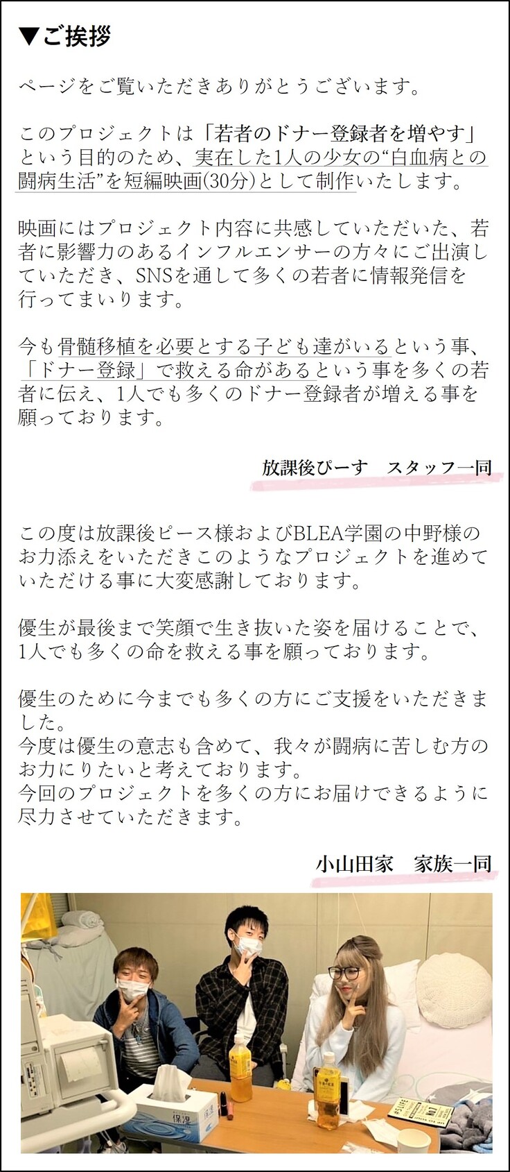 彼女の「同じ病気の子ども達の力になりたい」という想いを実現するためにご家族とも相談をした結果、彼女の闘病生活をドキュメンタリーとして制作し、より多くの若者に見ていただく事で「ドナー登録者を増やす」という取り組みを行いたいと思いました。