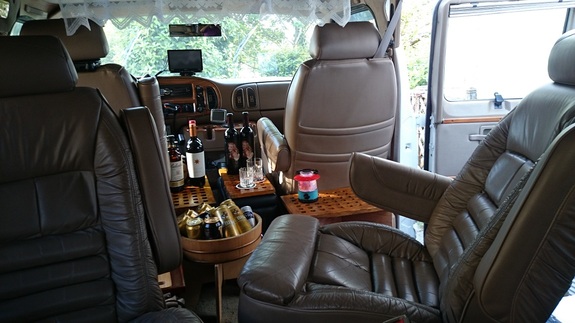 車内、運転席方向はこんな感じ。2列目の座席は自在に回転します。後ろに向けると、3列目の方と 向き合って座れます。これが、ウリです♪ 全席本革のふかふかキャプテンシート。天井も高く、大人が楽々6人座れます(運転手除く)定員7名。