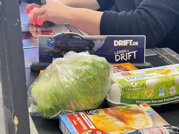 アデナウのスーパーマーケット「REWE」の、会計ベルトの仕切り板広告がドリフトだなんて、さすがニュルブルクリンクですよね。日常にレースが溢れているんですね。