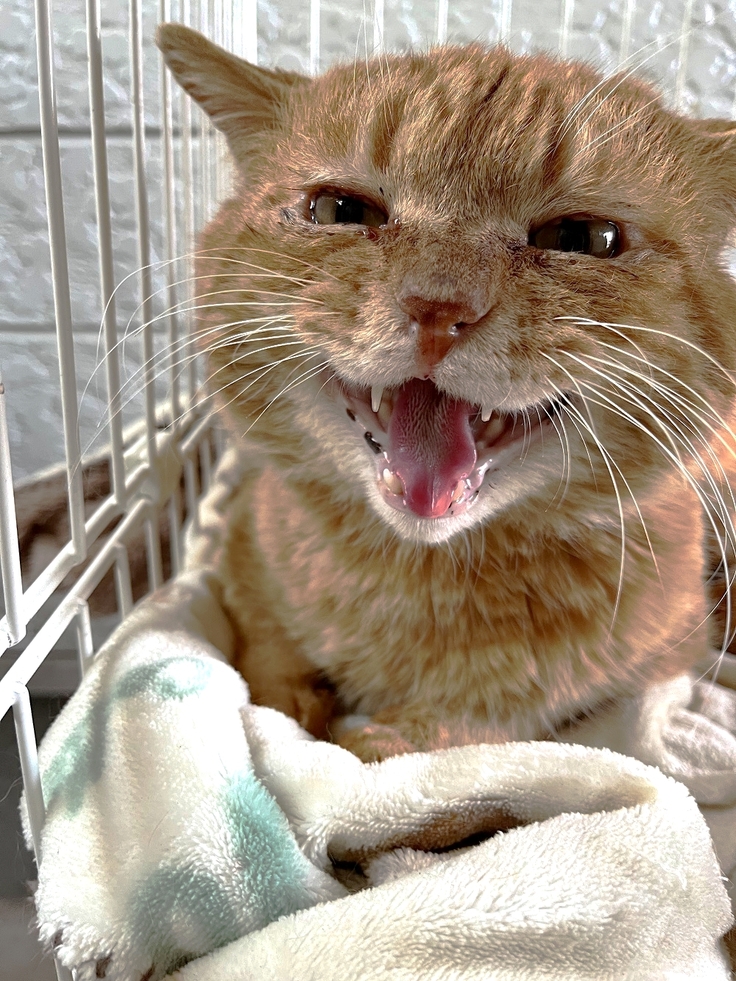 おいちゃん、もんちゃんは元気です!去勢後仲良くなってくれるか…??と思っていました。しかし、もんちゃんは仲良くしたそうにお腹を見せたりするのですが、おいちゃんは本当に嫌みたいでケージから出すとすぐに喧嘩をしに行くので直接合わせられません💦