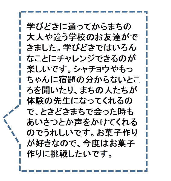 まちには学習塾や習い事環境が多くはないので、子どもたちは学校から帰宅したら家の中でゲームをしたり、テレビを見たりしがちなのですが、学びどきという拠点で、さまざまな体験や探究に挑戦することで、故郷のことを知り、頭だけでなく、郷土愛を育んだり、心の成長を遂げて欲しいと考えています。