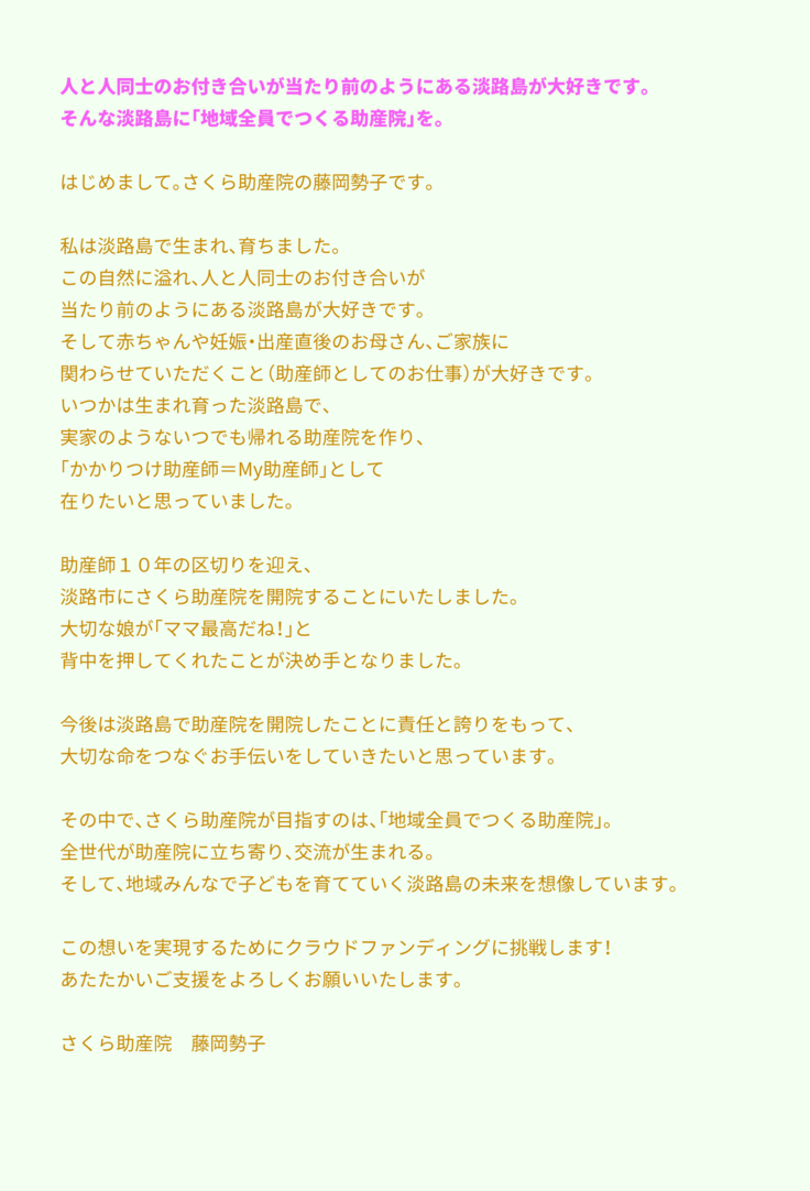 ただ、助産院立ち上げに当たって、インターン生が淡路島に滞在しながら様々な企業やお店の方々にご挨拶し企業様のご協力を前提とするイベントを企画し実現させるためには、費用が少なからずかかるということもまた事実です。しかし助産院自体が新規立ち上げで収入がなく、さらに改装工事や設備投資といった支出にどのように対処するかで手一杯ということもあり、前述の費用にまで手が回りません。そこで、クラウドファンディングを通じて皆様からの支援を是非とも頂戴したいと思っております。「将来の希望である赤ちゃんが誕生する助産院を応援したい」、「過疎化や人員不足が進む地域医療を支援したい」、「大学生のインターン活動を応援したい」、本プロジェクトにご支援頂くときの動機は様々だと思います。その多様さこそがさくら助産院の目指すものなのです。