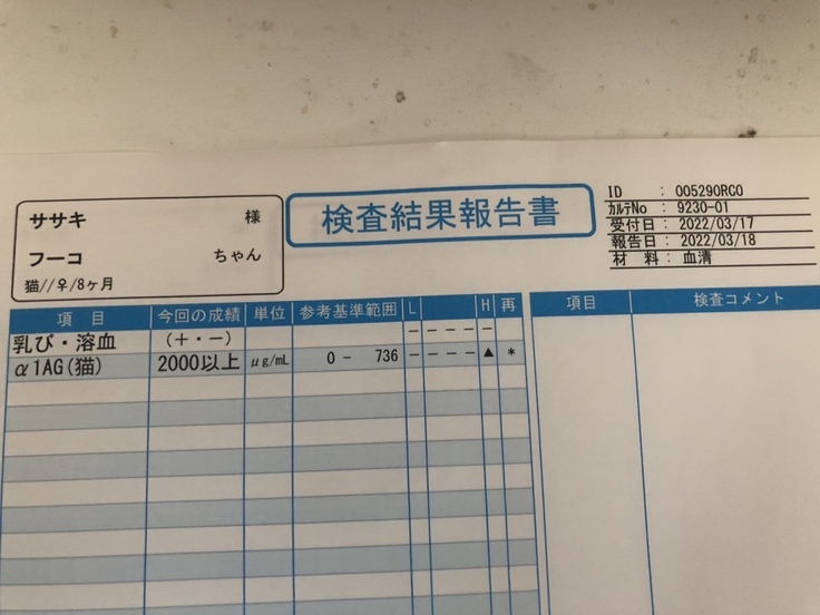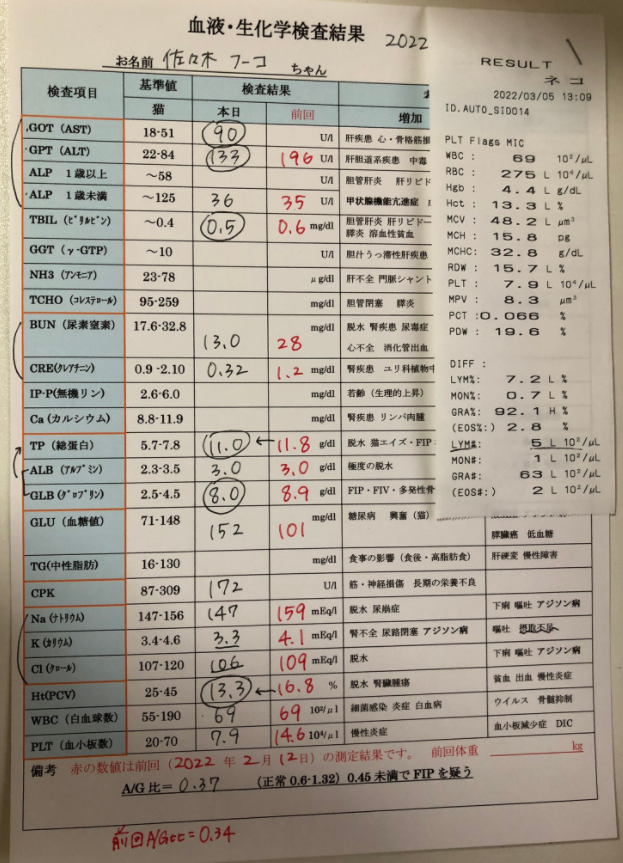 我が家にきた時から初期のFIPを発症していたのかもしれないのですが、急遽2/10-2/15まで入院し血液検査、コロナウイルス抗体値検査をして6400と結果が出ました。それに伴い貧血気味・・