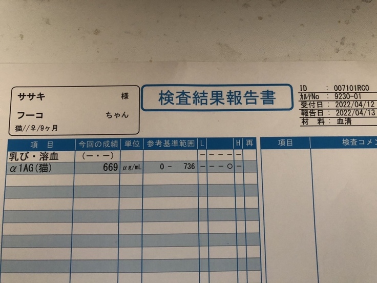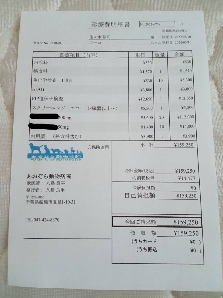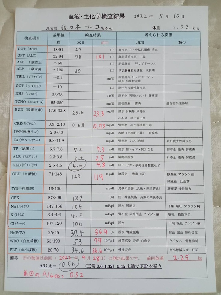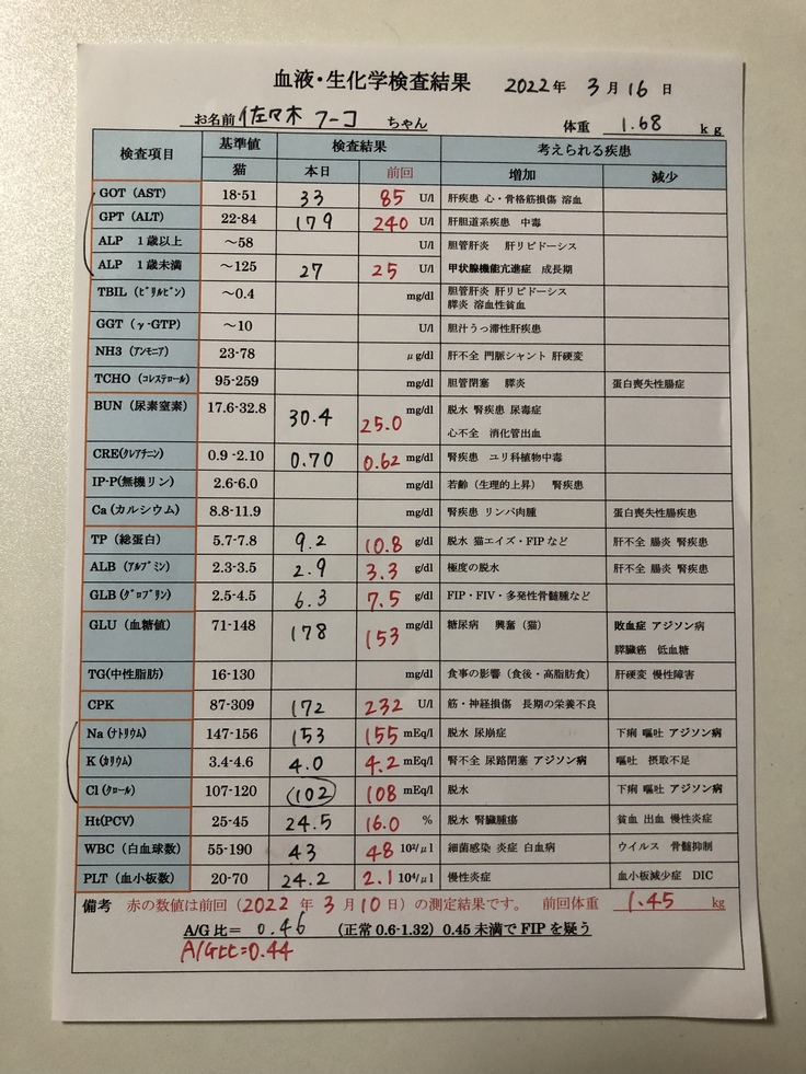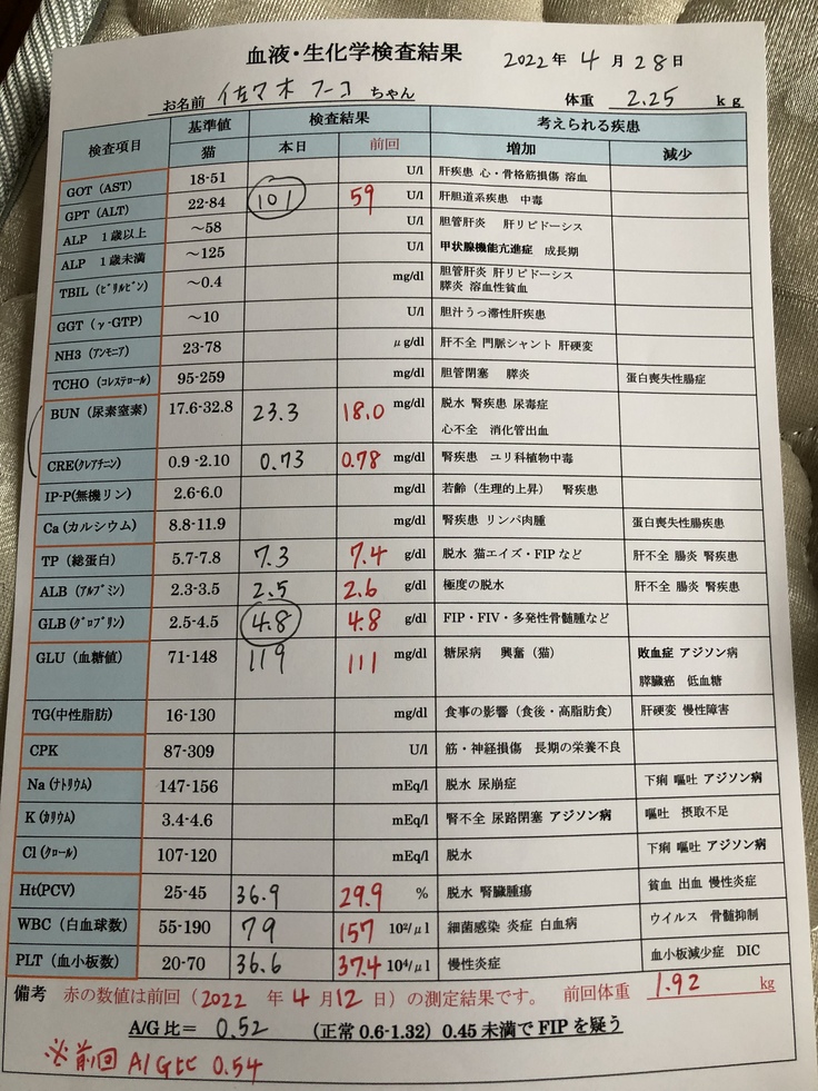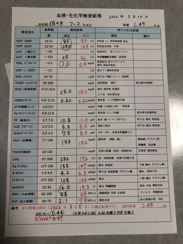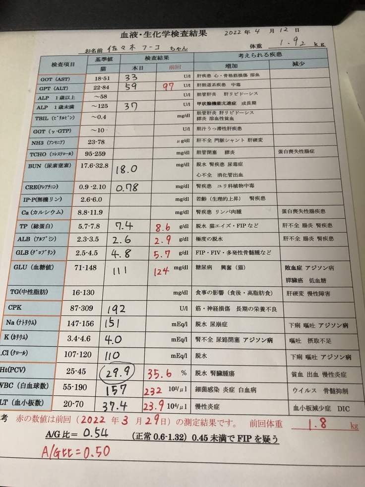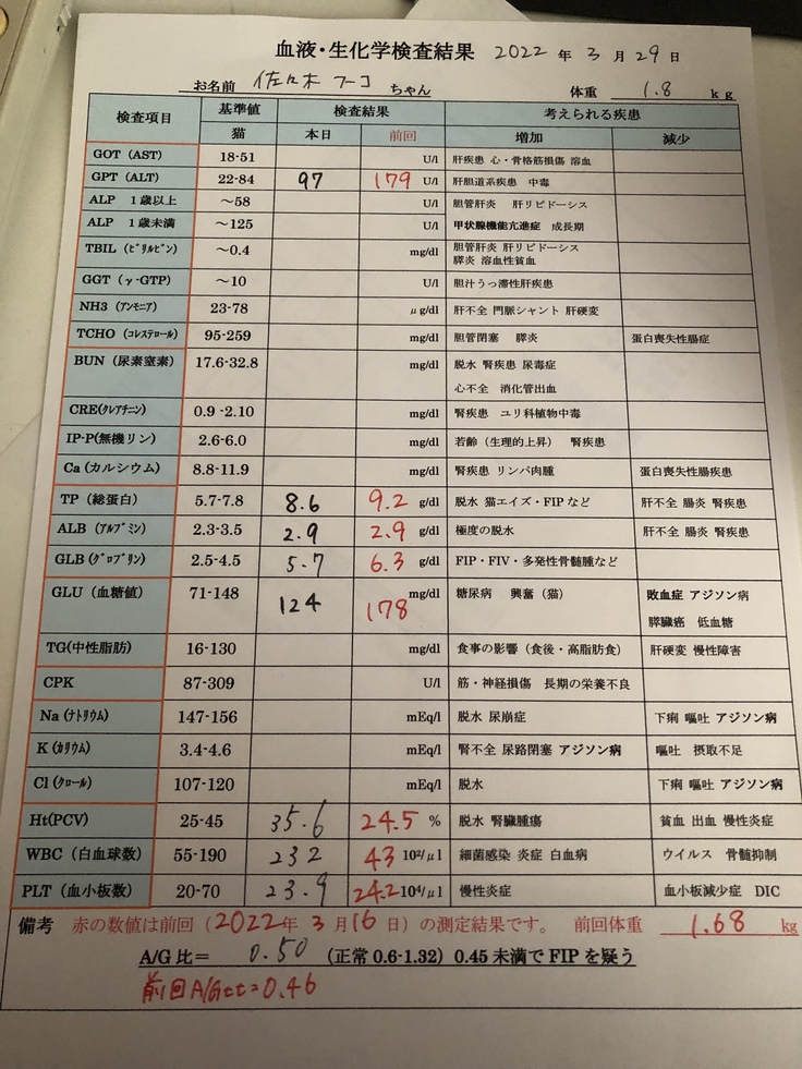 最初の検査から1カ月ほど経ってしまったので再度検査し、FIP中後期確定と診断されました。