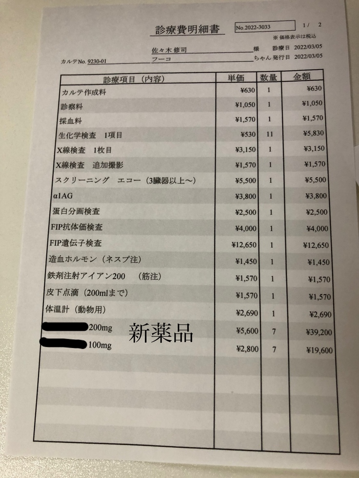 本格的に治療をはじめるため3/5に獣医さんの紹介でFIP治療をしてくれる病院に行きました。