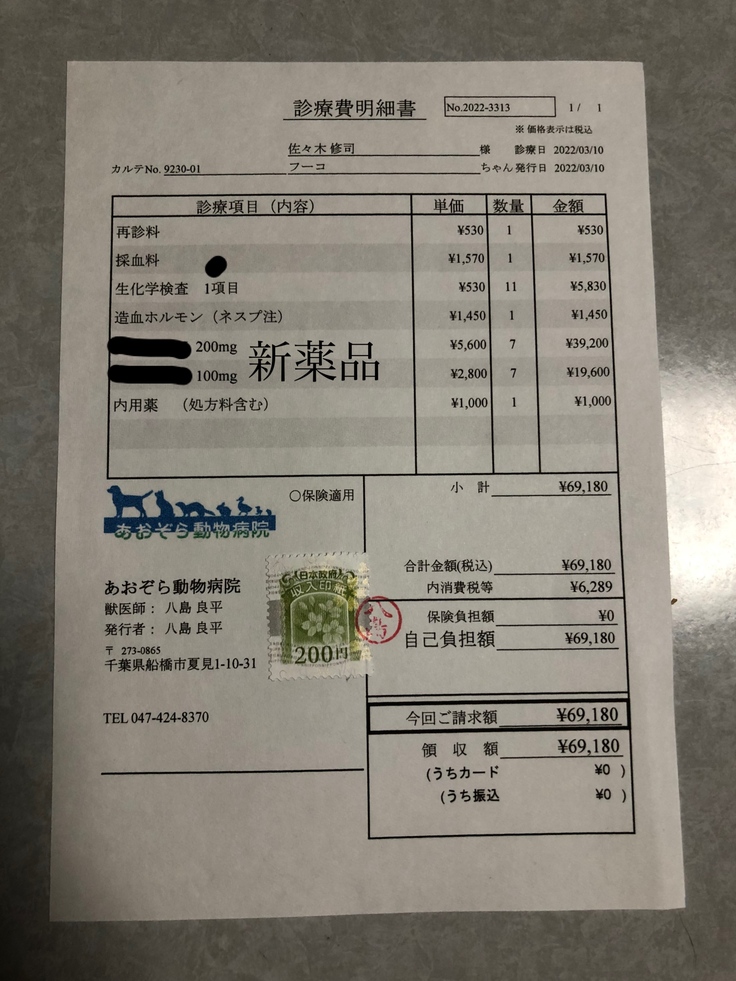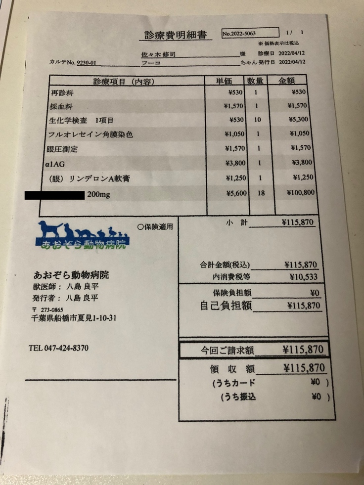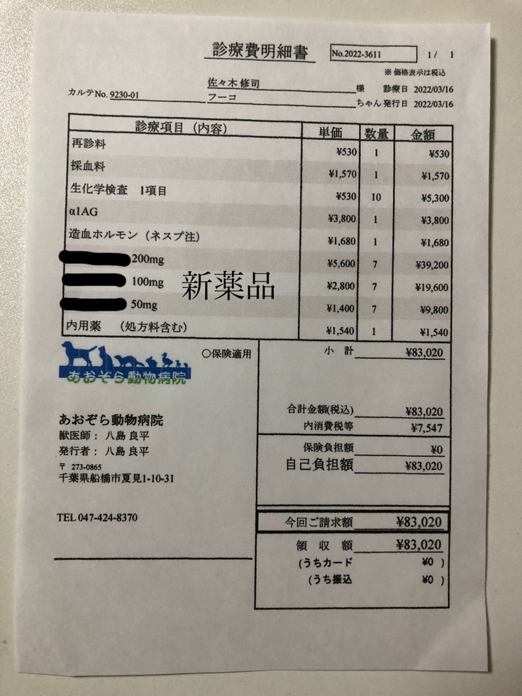 ざっと薬代だけでもこれだけかかってしまいそこから検査代や診察代などほかにもかかる見込みです。