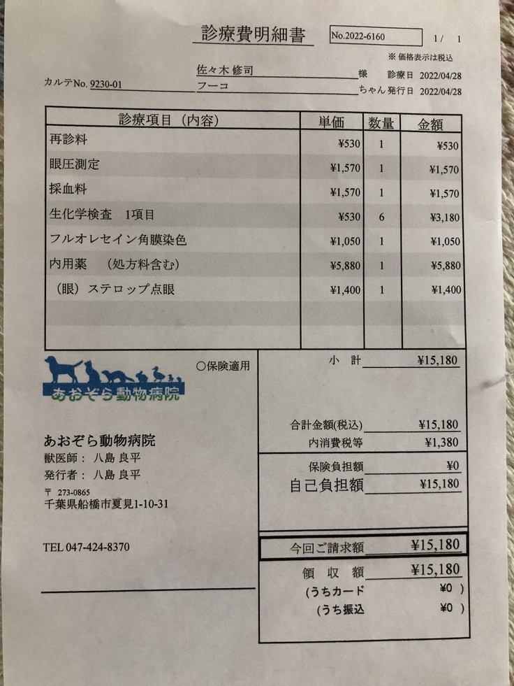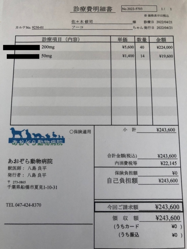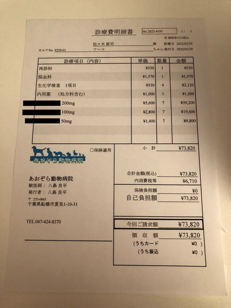 資金が足りない分は借金をしてフーコの治療に専念しているためこんなこと考えたくはないですが万が一フーコが亡くなってしまった場合は全額これまでの治療代に充てます。