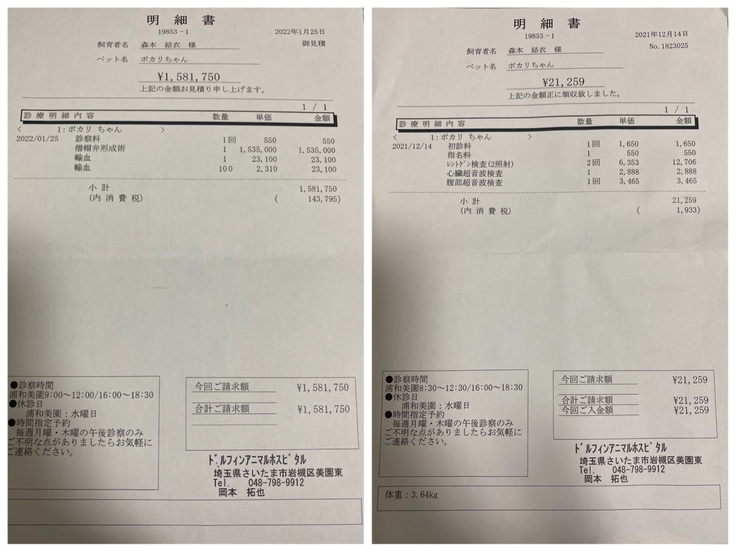 ※今回のプロジェクト達成後、術前検査の結果や急な病気の進行による、ぽかりの容態の悪化等により手術ができない場合、支援して頂いた金額は、今後の投薬治療費に充てさせて頂きます。